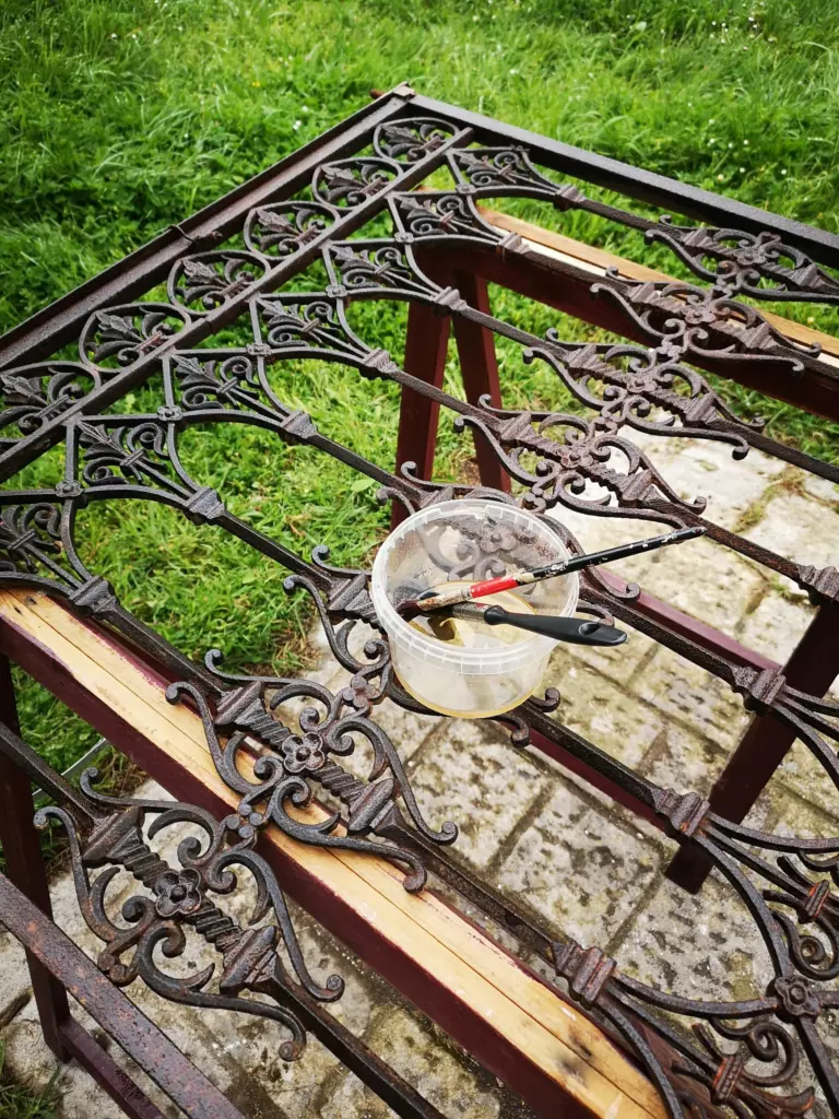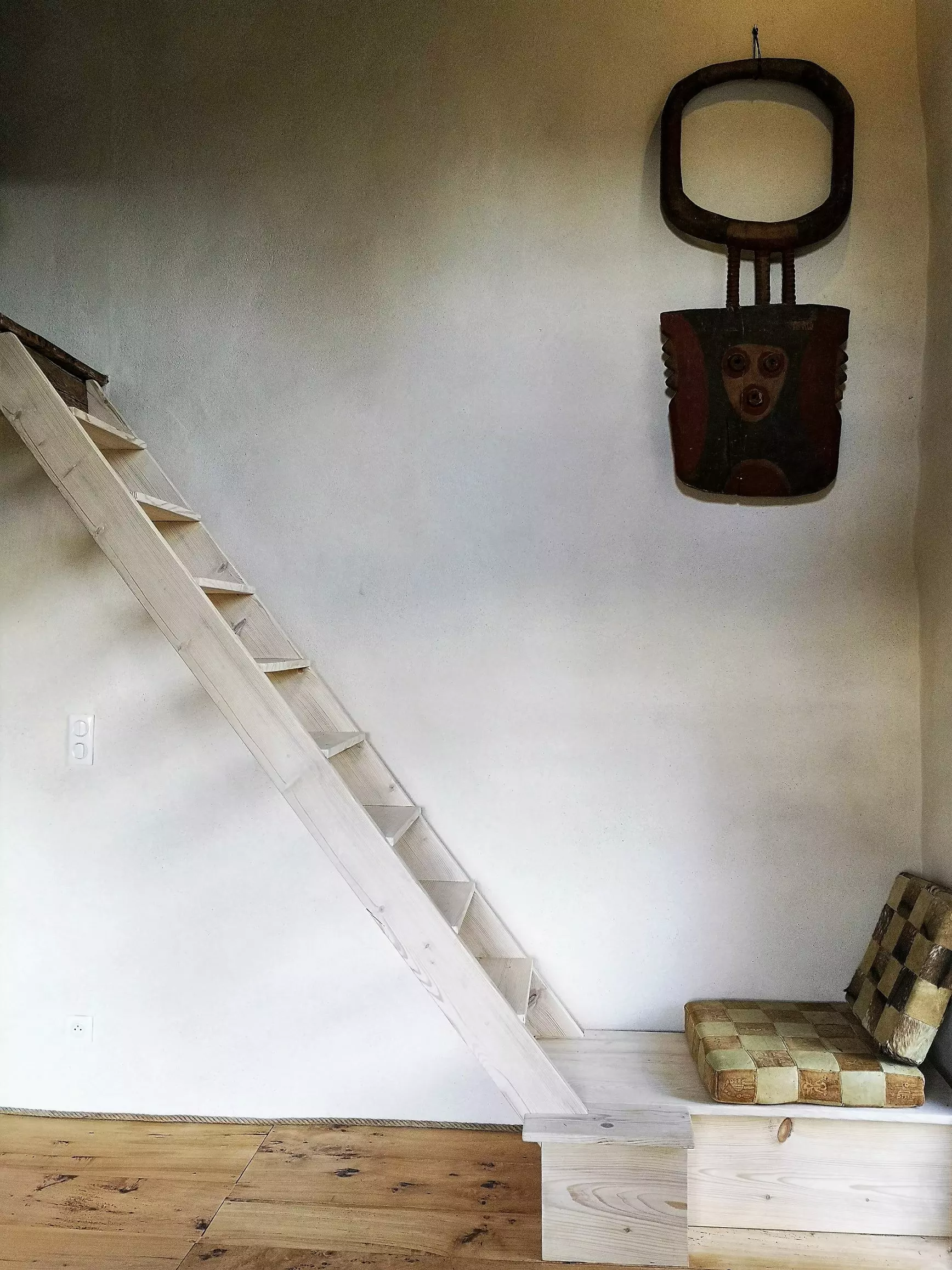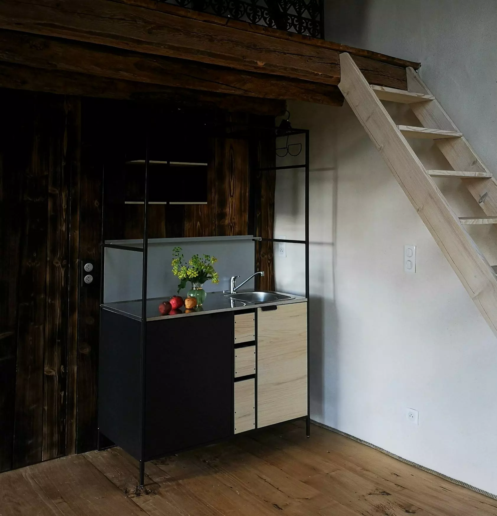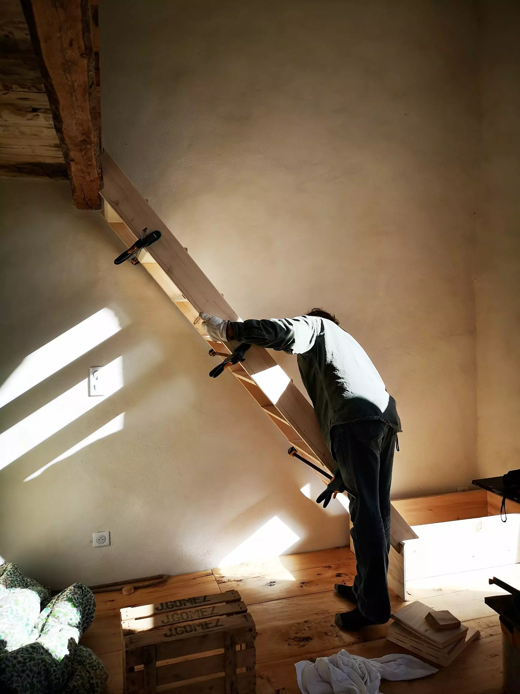 After a steep learning curve, we’re now about to finish a bijou bathroom and mini kitchen. Thomas has built a staircase to access the sleeping attic. Next up are installing an antique wrought balcony fence as a railing and restoring the original shed door.