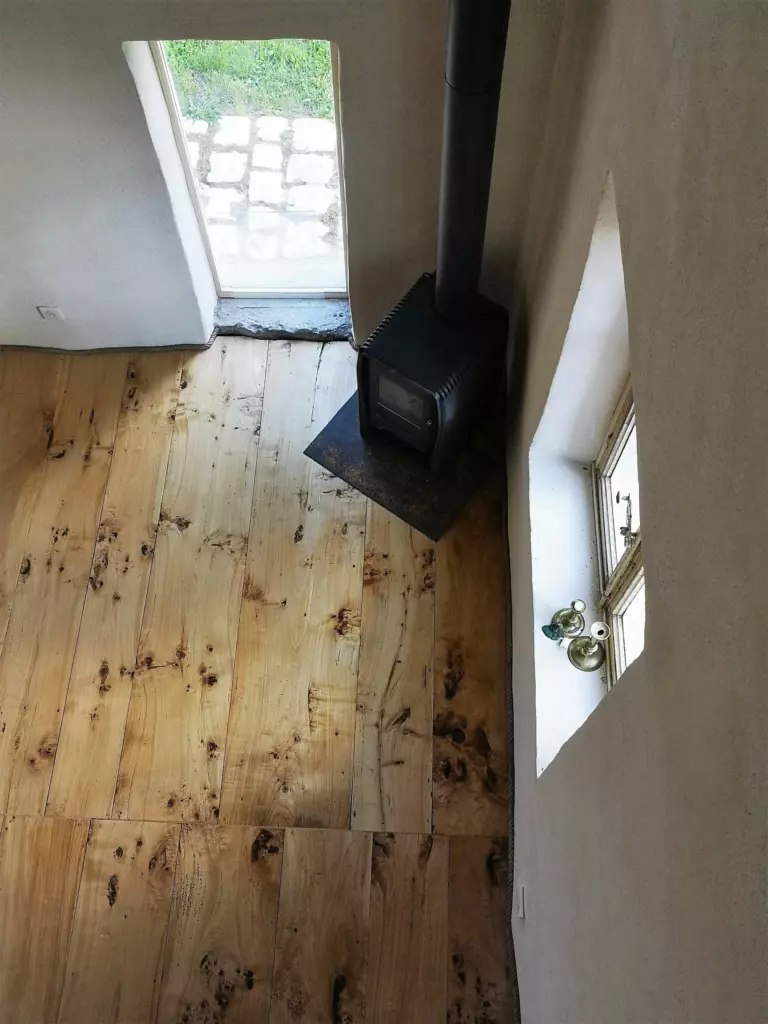 After removing and refitting the roof to make it watertight, excavating the floor, repurposing old cobblestones, consolidating the walls with lime mortar, putting in windows and a wooden floor, charring wall coverings, and laying a small terrace, we did much of it… all again. Disheartening, like I said.