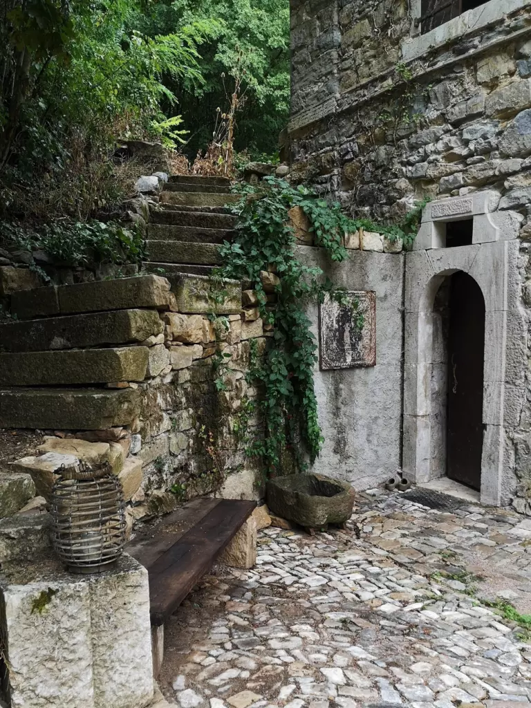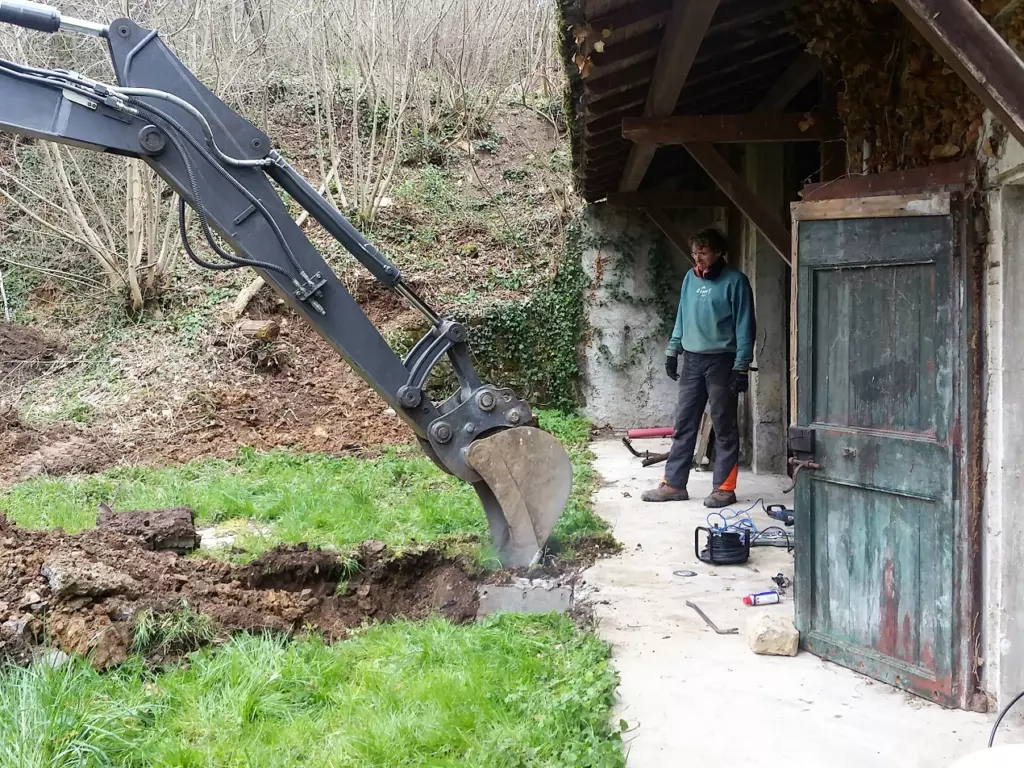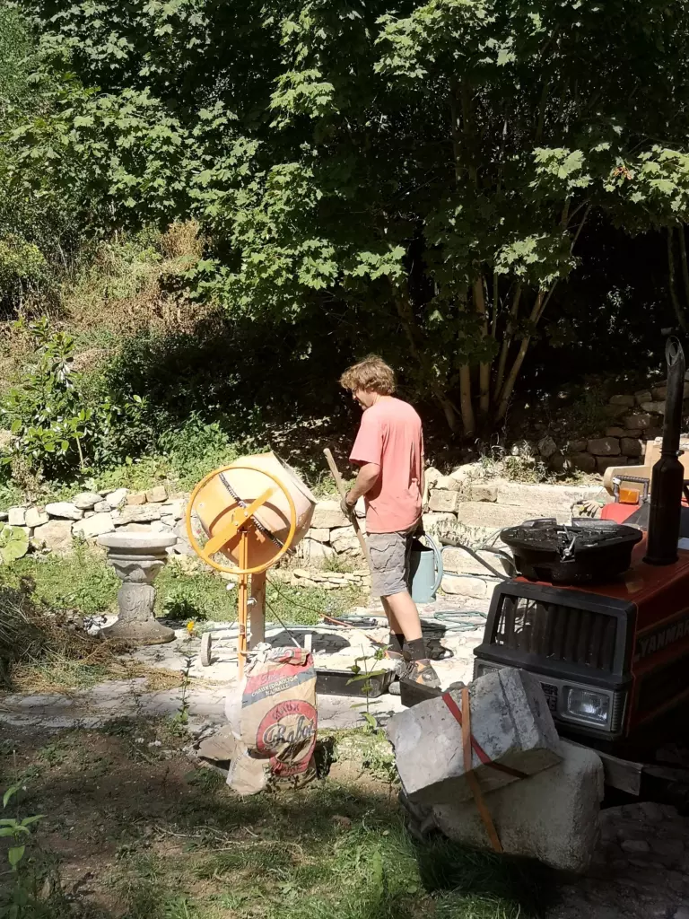 Still, over the years, whenever more pressing priorities allowed it, we worked on clearing this area. We got rid of the energetic dirt one step at the time. We cut undergrowth and carted rubble away. Coped with unexpected surprises – a wall that was at risk of collapsing because of construction errors, the rusty underground oil tank nobody told us about. Took down an ugly shelter that spoiled the facade of the house, stripped the old doors to reveal old paint or wood, and demolished concrete flooring to salvage flagstones.