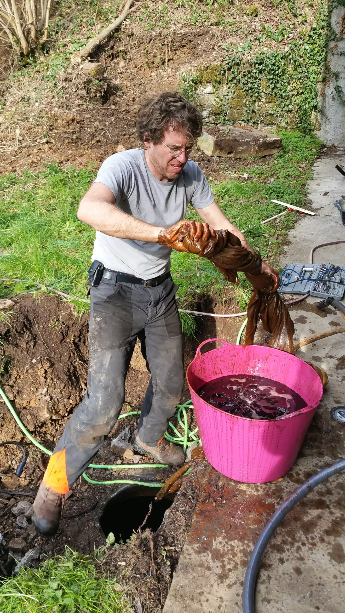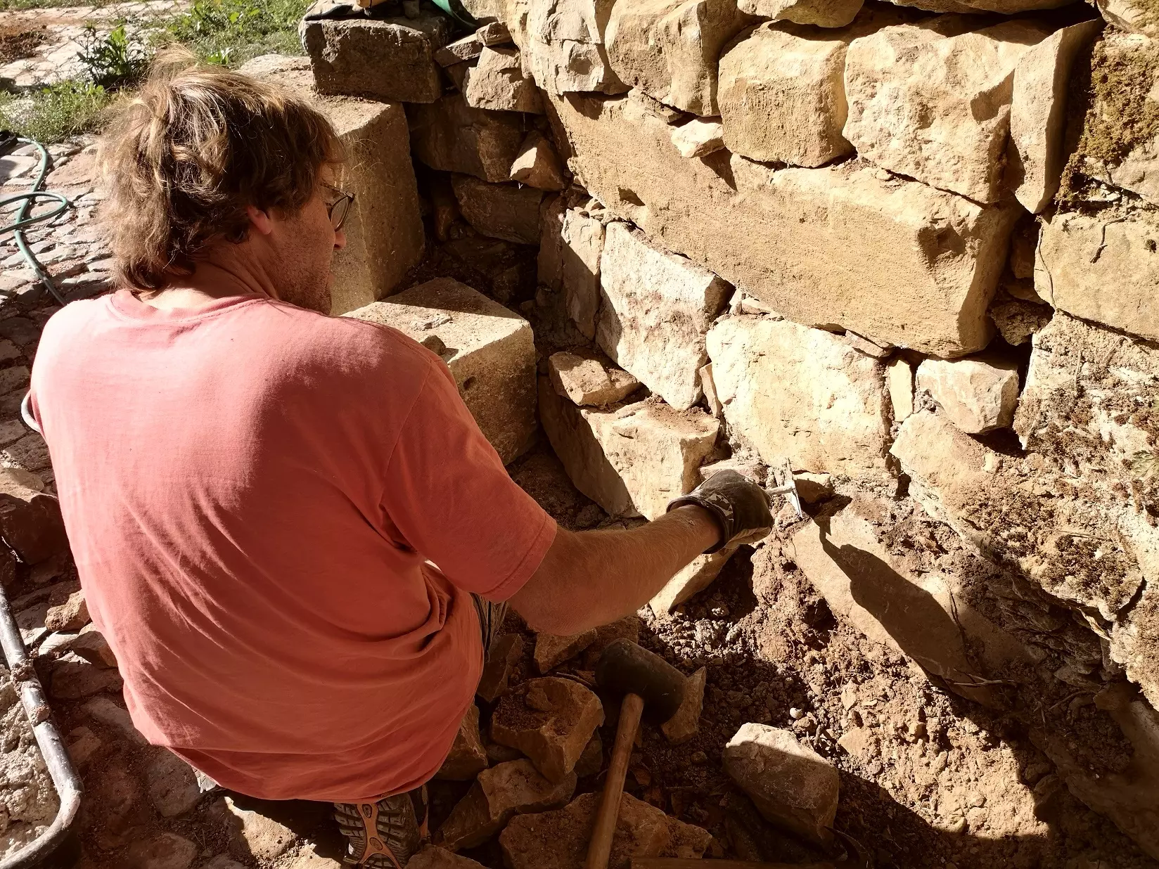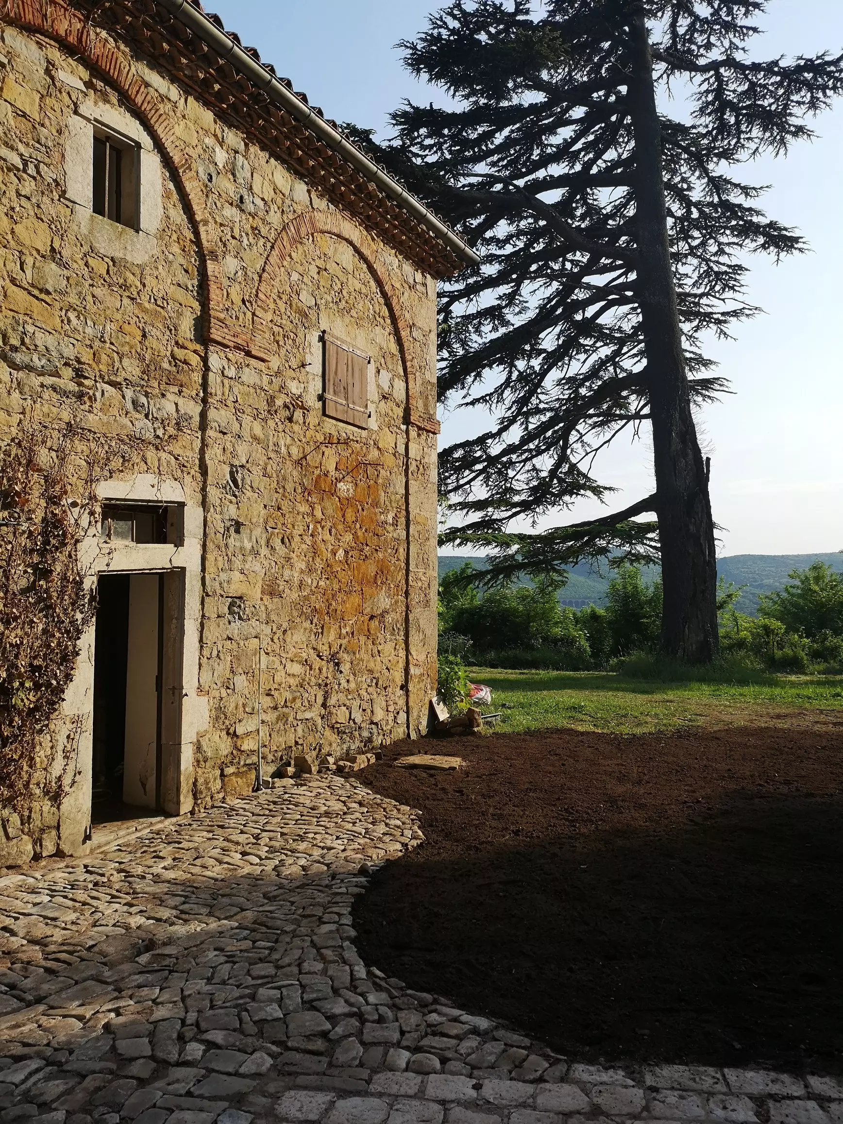 Still, over the years, whenever more pressing priorities allowed it, we worked on clearing this area. We got rid of the energetic dirt one step at the time. We cut undergrowth and carted rubble away. Coped with unexpected surprises – a wall that was at risk of collapsing because of construction errors, the rusty underground oil tank nobody told us about. Took down an ugly shelter that spoiled the facade of the house, stripped the old doors to reveal old paint or wood, and demolished concrete flooring to salvage flagstones.