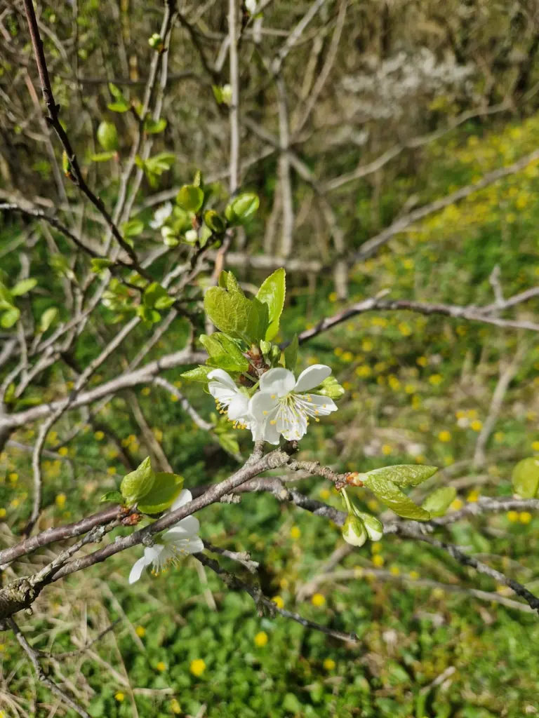 The early spring sun is out, though. And one day I begin to notice things I had not seen before. The shapes of what has fallen, the curve of a branch. Beneath the work, beneath the exhaustion, something is slowly unfolding. Blossoms push through mud and frost.