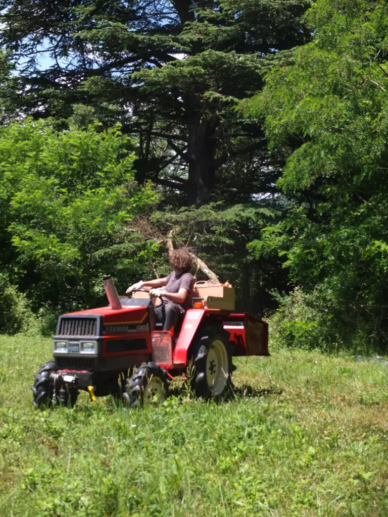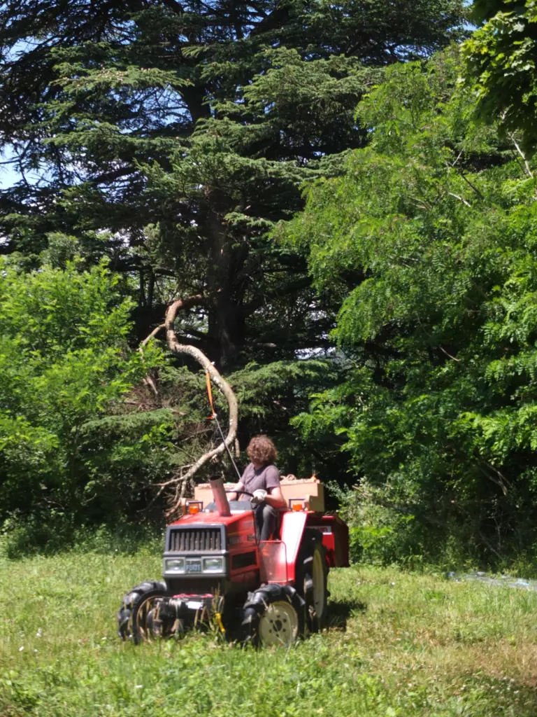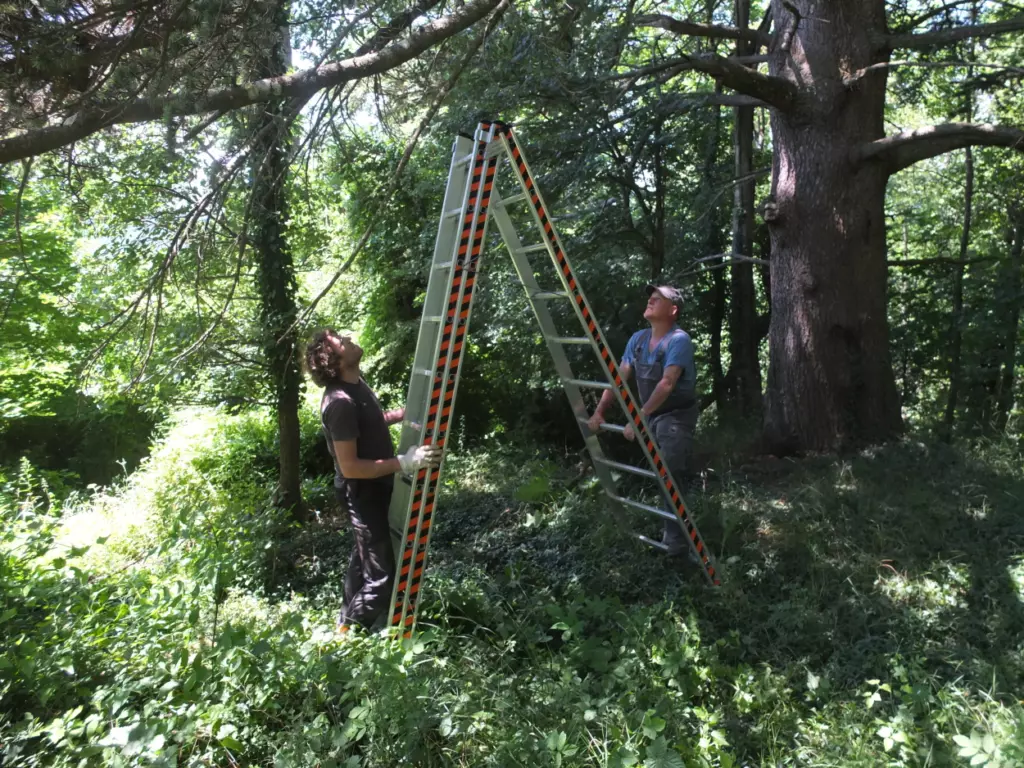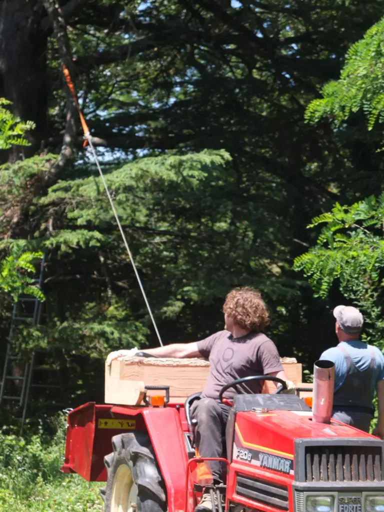 While Cédric, the forester, is busy drafting a plan for our property, we try and take care of some of the most urgent tasks ourselves. Such as tree first aid in the aftermath of a major storm. One cedar at the back of the château broke a large limb (200 kilos at least!) and it was still hanging in the other branches. Thomas and Willem spent most of their time on preparation and safety precautions -looking up and looking down, and then up again- and on making sure to leave no wounds so the tree can recover faster. It took close to a full working day to get the job done, from taking down the branch to cutting up the wood and stacking it to dry. A very rewarding and empowering experience. We can actually learn how to do this, little red tractor and all!
