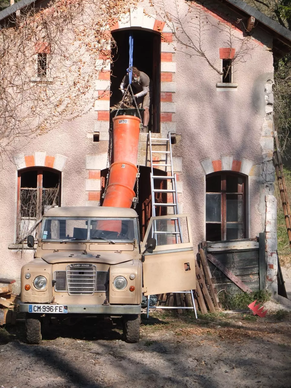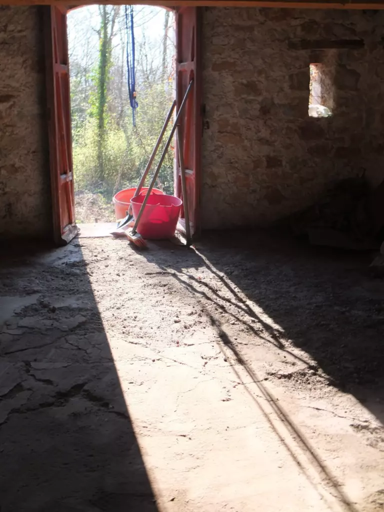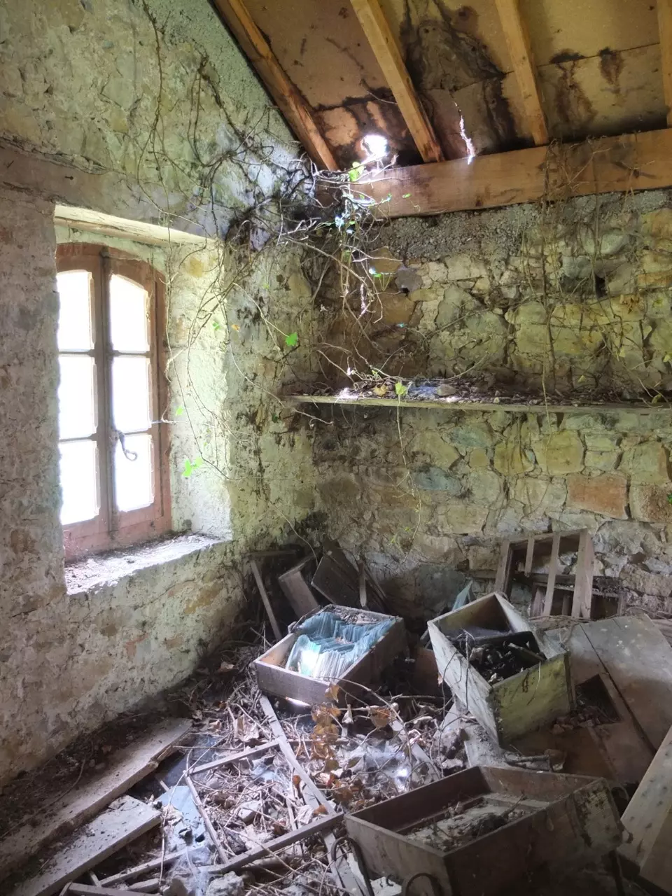 Climb up a ladder to reach the top floor of Lescure’s old bakery and through the weathered door you observe a most melancholy picture. Dim light through broken windows, mouldering walls and layers of destruction, all slowly being suffocated by ivy. We would have left this loft in its sorry state for years to come if we didn’t need storage space for building materials we’re salvaging from the grounds. Begrudgingly I set out to work my way through this wreckage – some days I just cannot face cleaning up yet another pile of rubble. The dust, the insects, the fungus, the weasel excrement.