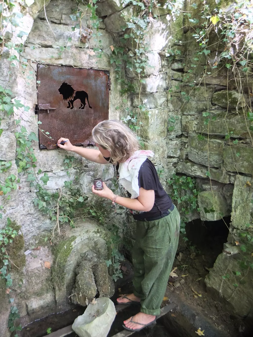 Then this summer, came these times of drought. The lack of rain and supreme heat had us descending into the woods daily to worriedly check the water levels of the spring. It also drove us to look for jobs in the shadows, sheltered from the blazing sun. Clever craftsman Ulysse started repairing the framework of the door above the spring, working fire and metal like a modern day Hephaistos. Thomas eased the metal door back in and I took care of cleaning and the finishing touches with anti-corrosion oil and a little paint.