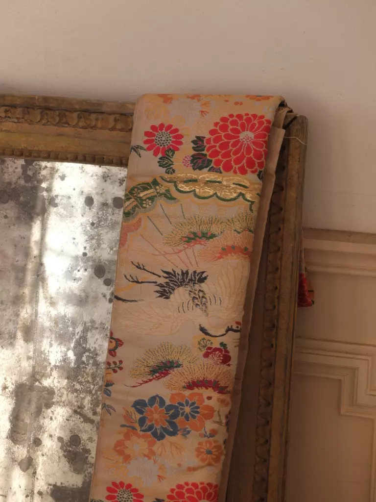 As a Dries van Noten devotee, my fashion heart goes out to arty-ethnic textiles, eclectic and decorative pieces. Transported by the romance of the castle and its surroundings, my style of dressing easily translates into interior design for Lescure. I’m sounding out ideas, thinking about elements, playing with fabrics. When I came across vintage obis (the wide brocade sash tied around a Japanese kimono) I was tempted to use these in the castle to dramatic effect. But how do I reconcile this with my exploration of the wabi-sabi aesthetic? Wabi-sabi honours the imperfect, the unfinished, and the ephemeral. A geisha’s kimonos and obis are anything but. They represent the opposite—perfection in vivacity. As always, the answer has come from the château itself, showering the obis with the most beautiful light against its muted walls.