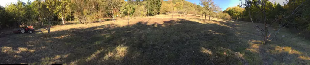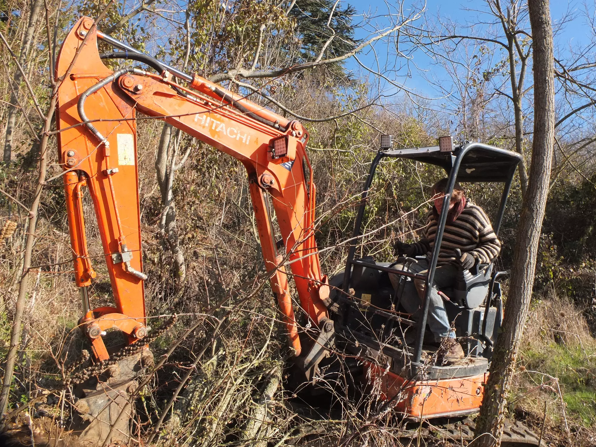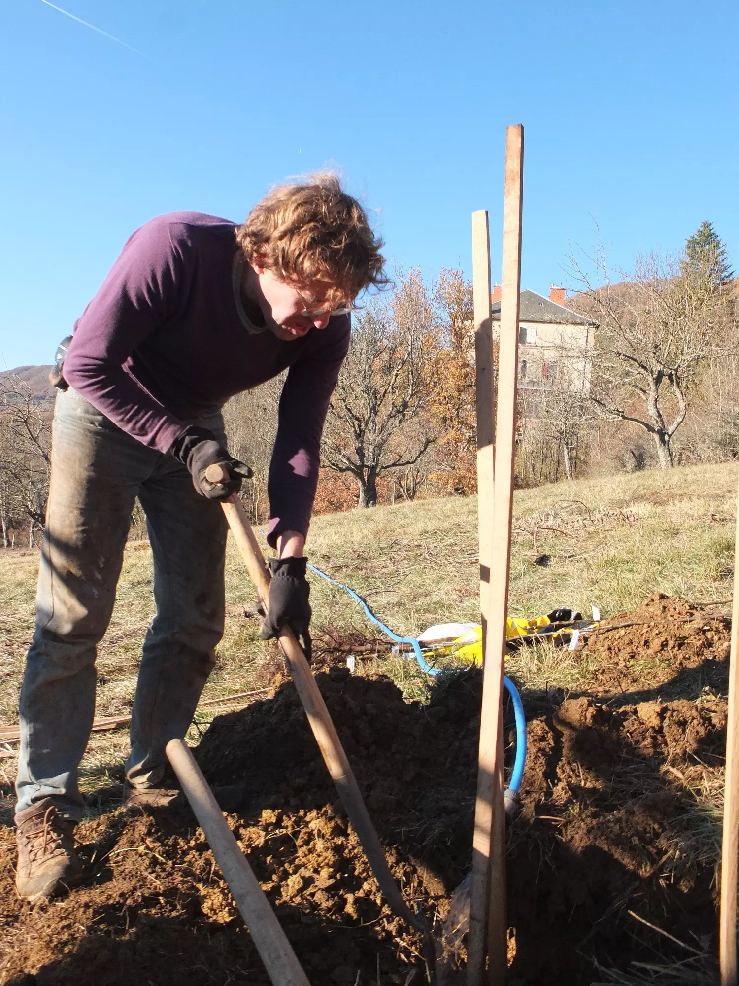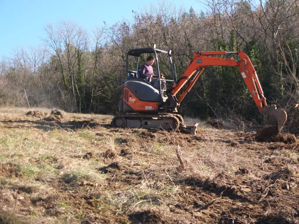 First, a large swath of orchard overgrown with impenetrable thickets of brush, bramble and wild trees needs clearing. Once the trees have toppled, we’re chipping branches and chopping trunks for fire wood. There are backbreakingly heavy tree roots to dispose of and we learn that digging holes in Lescure’s clay soil is no mean task. Boom, pivot, bucket. And repeat. For days and for hours on end, we’re toiling away at the land. Until the sun breaks through and we’re looking at open grassland and ten beautiful holes for planting.