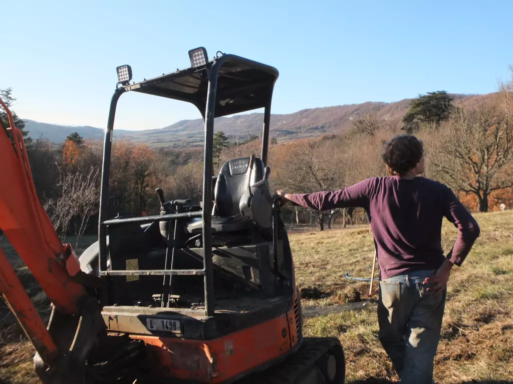 In the chilly morning drizzle, Thomas is setting out to plant fruit trees. Perhaps you now imagine him skipping through the fields, brandishing a spade and a trug of woven wicker to hold the tender plants. Sorry to burst your daydream bubble, but the man is operating an excavator.