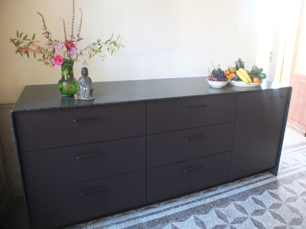 I had imagined we would be popping like champagne with crazy suggestions during our brainstorming sessions. Instead, we clenched at individual ideas. We spent hours staring at the walls and the ceiling, with Frank and Rik extolling the virtues of the clean lines of the Palladio style. We had endless discussions on the pros and cons of wall cupboards, Thomas willing to accept that upper cabinets and Palladio don’t mix, but also trying to figure out where pipes would run and how cutlery and crockery would fit. And I was obsessed by the colour scheme, way too early in the process. Would purple brown work or should we add a tad more aubergine?