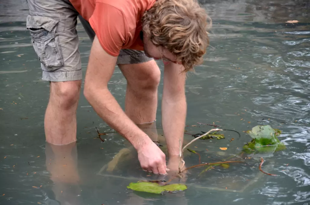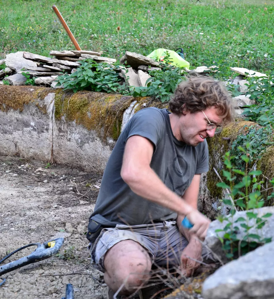 First, there was ever-optimistic Thomas trying to do everything by hand and on his own. From de-rooting trees and shrubs that were occupying the basin to removing the damaged stone floor. Thankfully, he ended up hiring an excavator and welcomed the helping hands of friends and local craftsmen. Next up was weeks of research, deciding the best way to make the basin waterproof again. And there was this one dark night. Thomas worked all hours to finish the sealing before the deadline of rain that had been predicted. Just as he was contemplating giving up, he was allegedly joined…by a little green frog! Exhaustion causing hallucinations or Lescure working its magic? Whatever you choose to believe, French Kermie kept the man going and he finished the job in time for the rains.