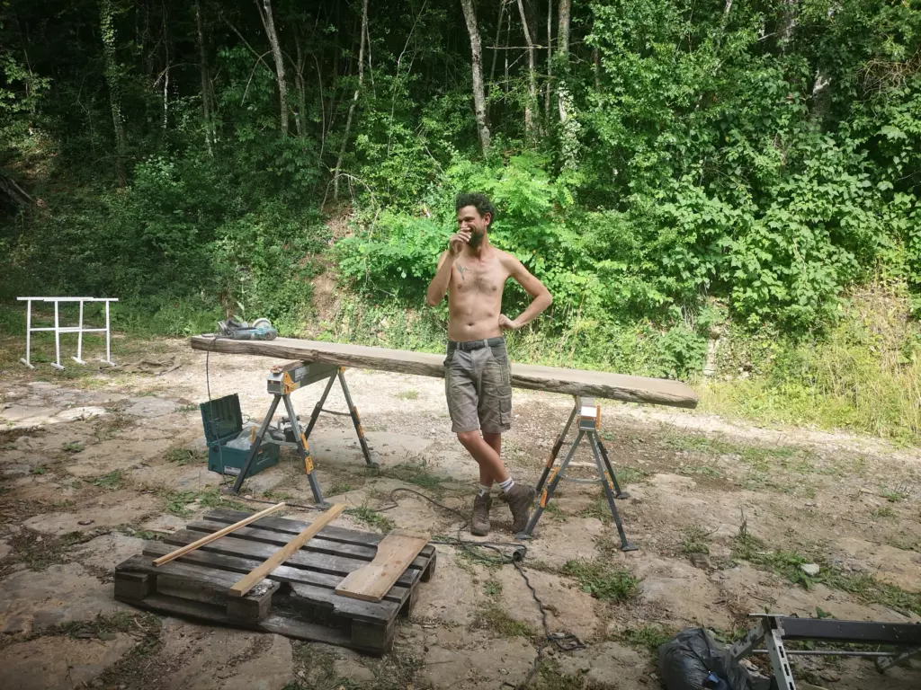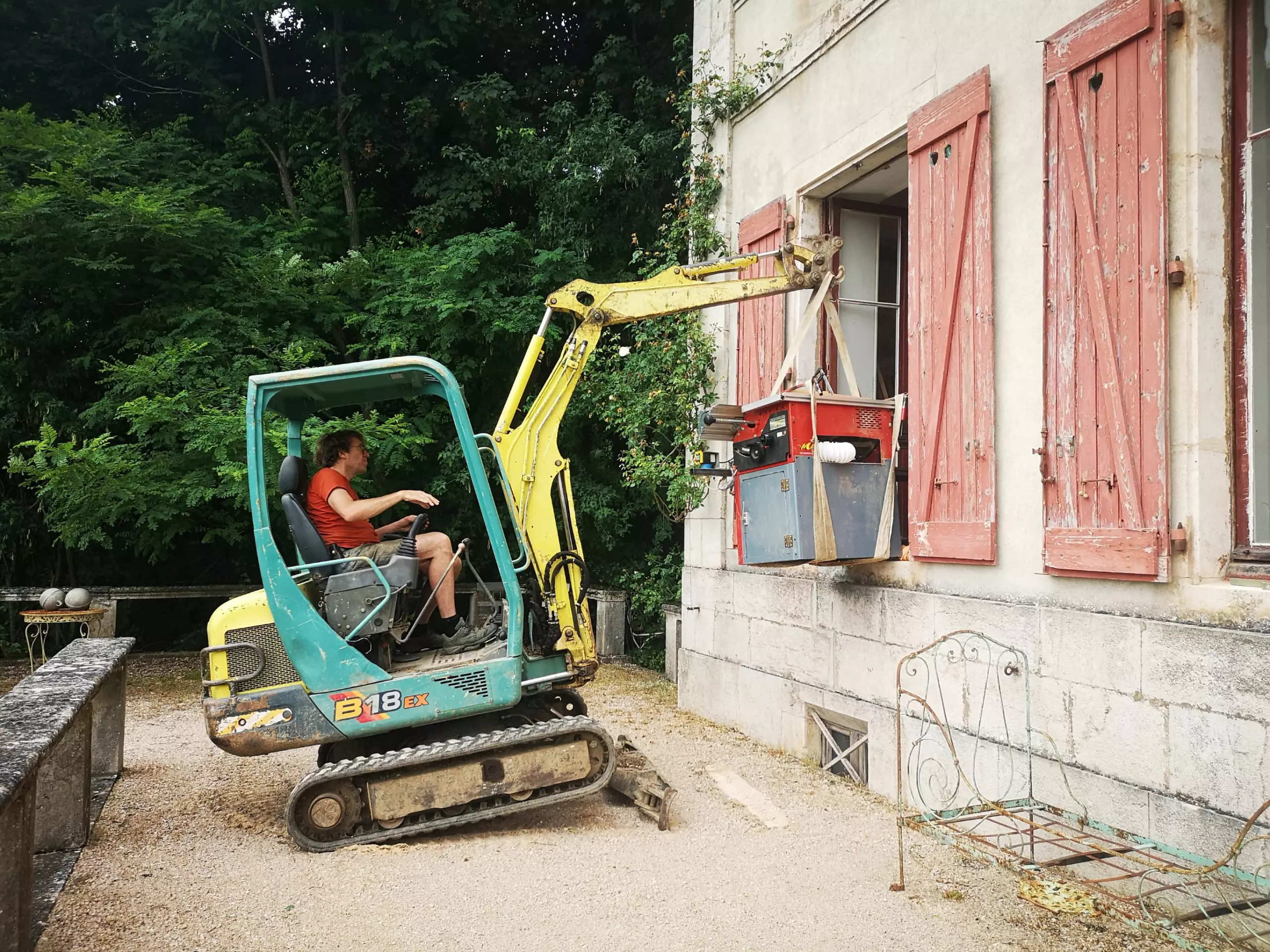 Then came the creative part: designing the workshop and figuring out how to best use the space. A large workbench for woodworking? Ample storage for tools? Maybe even a cozy corner for me to read while Thomas works on his projects? They brought in all the tools and heavy machinery, and once again, the excavator proved useful as a lifting tool. To make the space truly his own, Thomas added personal touches – an old poster, some African artefacts that reflect his life.