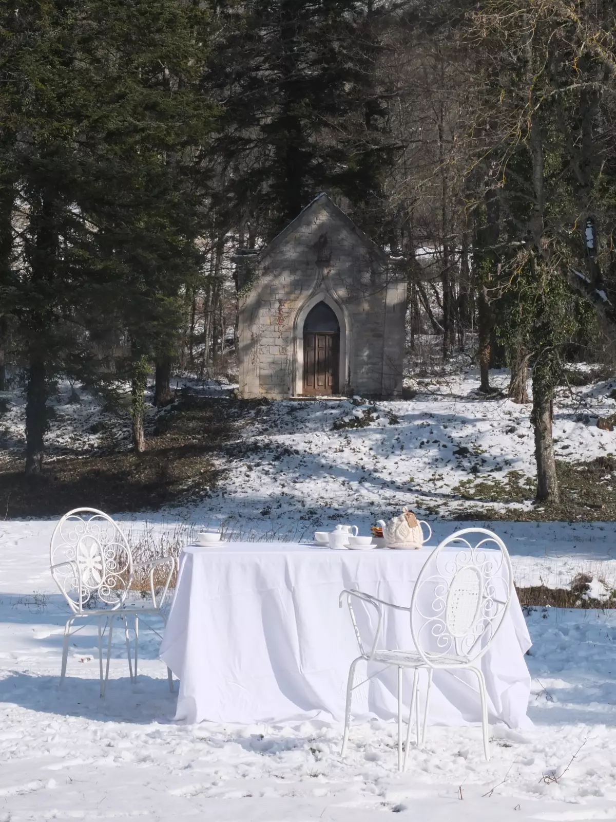 Ms. Bush inspired me to play out my own fairytale, so the next day I set up for afternoon tea on the lawn. The ingredients? An antique white linen cloth, the finest bone china from Tipperary and the backdrop of our chapel in the snow. The elegant scene was further complemented by the presence of rugged-looking Thomas and Willem on a break from demolishing a wall. The china is a castlewarming gift from our Irish friend Noreen. From her needles also came a traditional tea cozy made from super soft and warm Aran yarn. Also note the plate of castle made waffles. They were absolutely delicious! Keep an eye on this blog for the recipe.