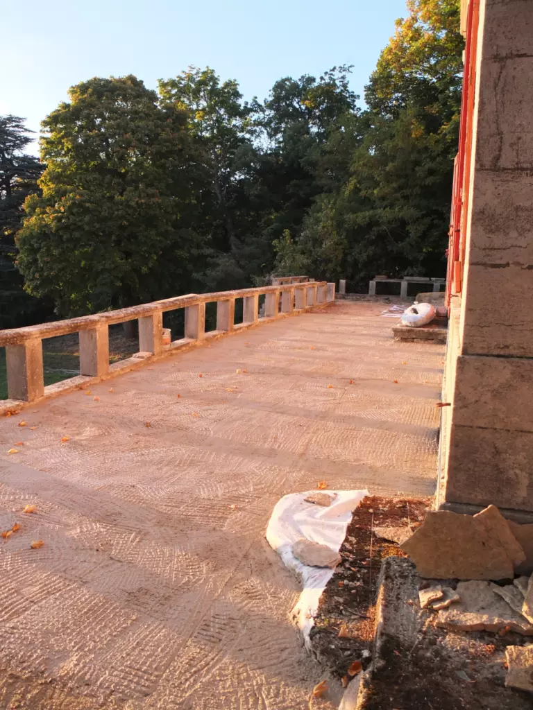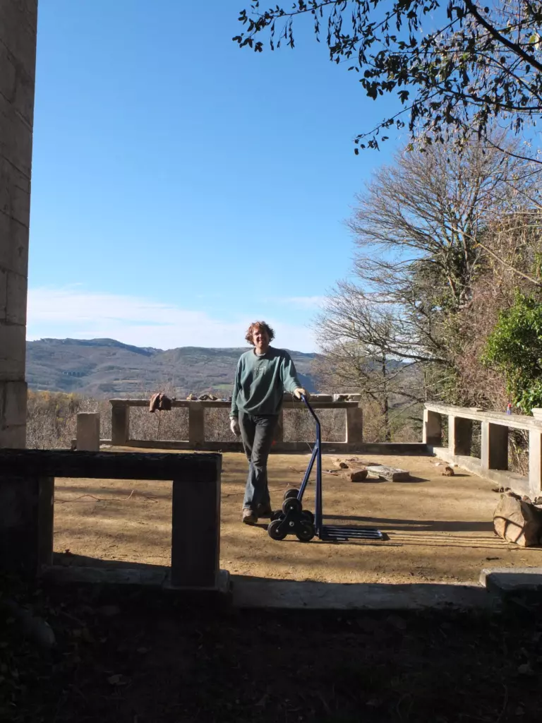 In its years of abandonment, the château’s terrace was slowly overtaken by nature. Some people find ugliness in misplaced stones and impetuous plant growth, we took delight in carrying ourselves up the broken steps leading to the balcony. Arms and legs gently scratched by the thorns of wild roses and blackberries, we enjoyed endless cups of afternoon tea and pre-dinner drinks with a view of the valley. Now it’s all very well lounging about on a romantic ruin, but when dilapidation causes structural decay -cellar floods when raining- intervention is called for. Deciding on a course of action took months. We spoke to construction workers who only ever worked on new development and so had no clear sense of what we’re trying to achieve. We tried explaining that we don’t regard perfection as beautiful to builders with a passion for reinforced concrete. Trust me: pronouncing wabi-sabi with a French accent is not enough to convey the beauty of imperfection and asymmetry to those who think this way lies madness.