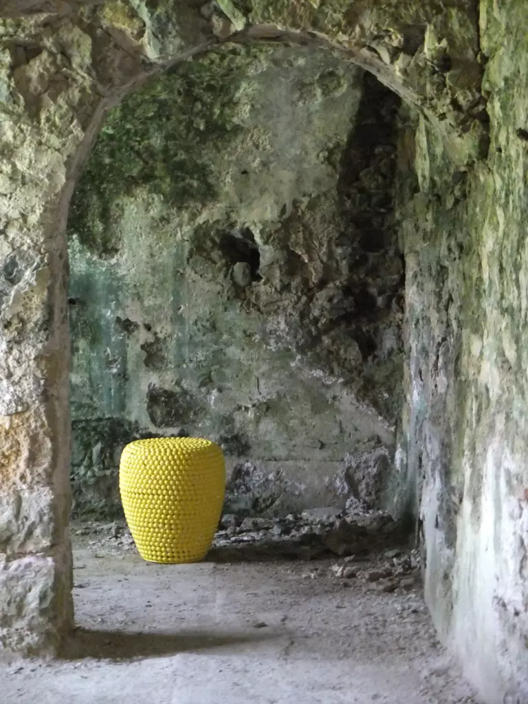 Best of all, we now have the smallest art gallery in Lescure’s underground world. Upon suggestion of a curator friend who imagined a dash of modern yellow in the rubble, I put a bright metal stool against the blueish green of water-damaged wall. Architects have come and gone, construction workers have come past, and still the terrace sheds a waterfall of tears into this part of the vault. Regina Verhagen’s ceramic tear shaped drops (a gift for Thomas from another artlover friend) bear witness to Lescure’s sorrow and our increasing anxiety about the unstoppable leakages. Art as solace. From now on, we’re finding calm through creativity and letting art lead our response to troubled renovation worries.