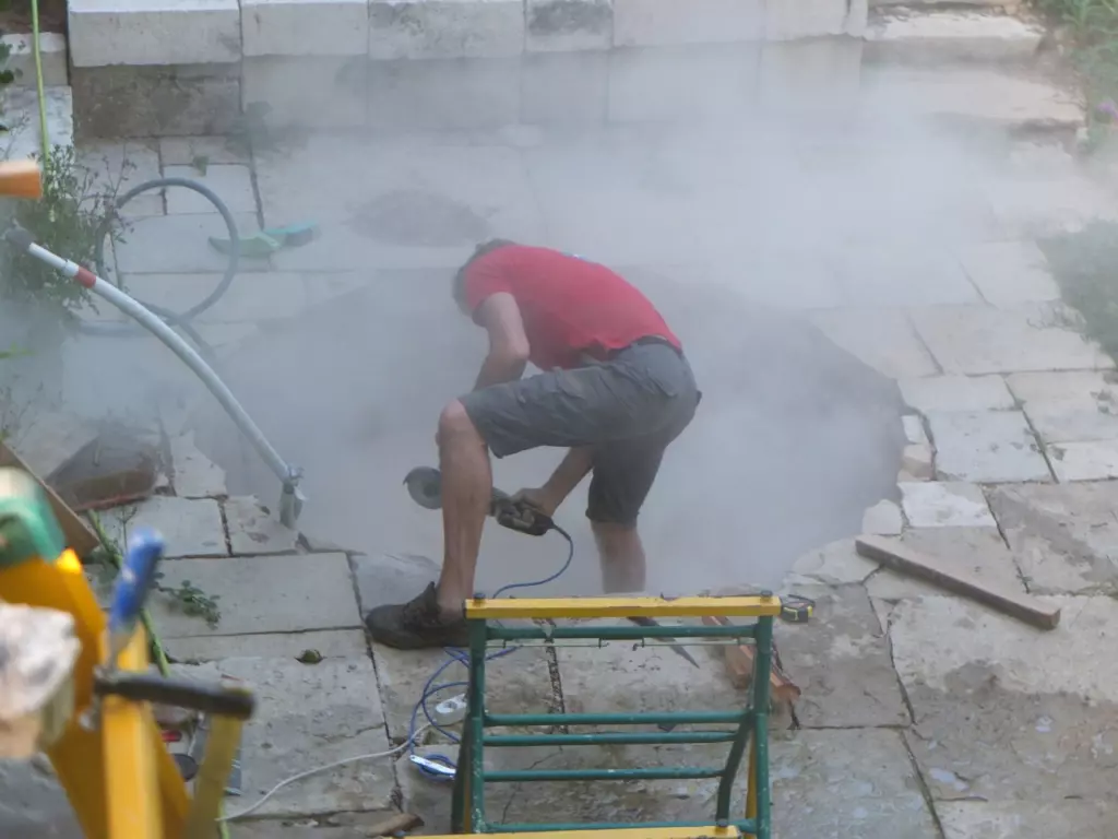 First, we scouted around for the perfect spot. Atop the steep slope underneath the orangery seemed ideal. Secluded, protected from the elements by an old wall, yet with a view of the orchard. Only we needed to get rid of all the debris and green overgrowth first and build a handsome terrace from ancient stones with a custom hole for the hot tub.