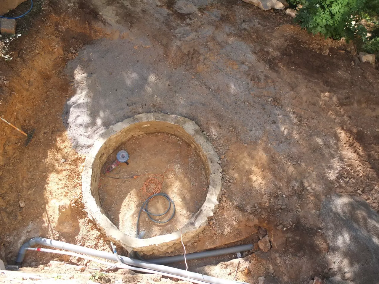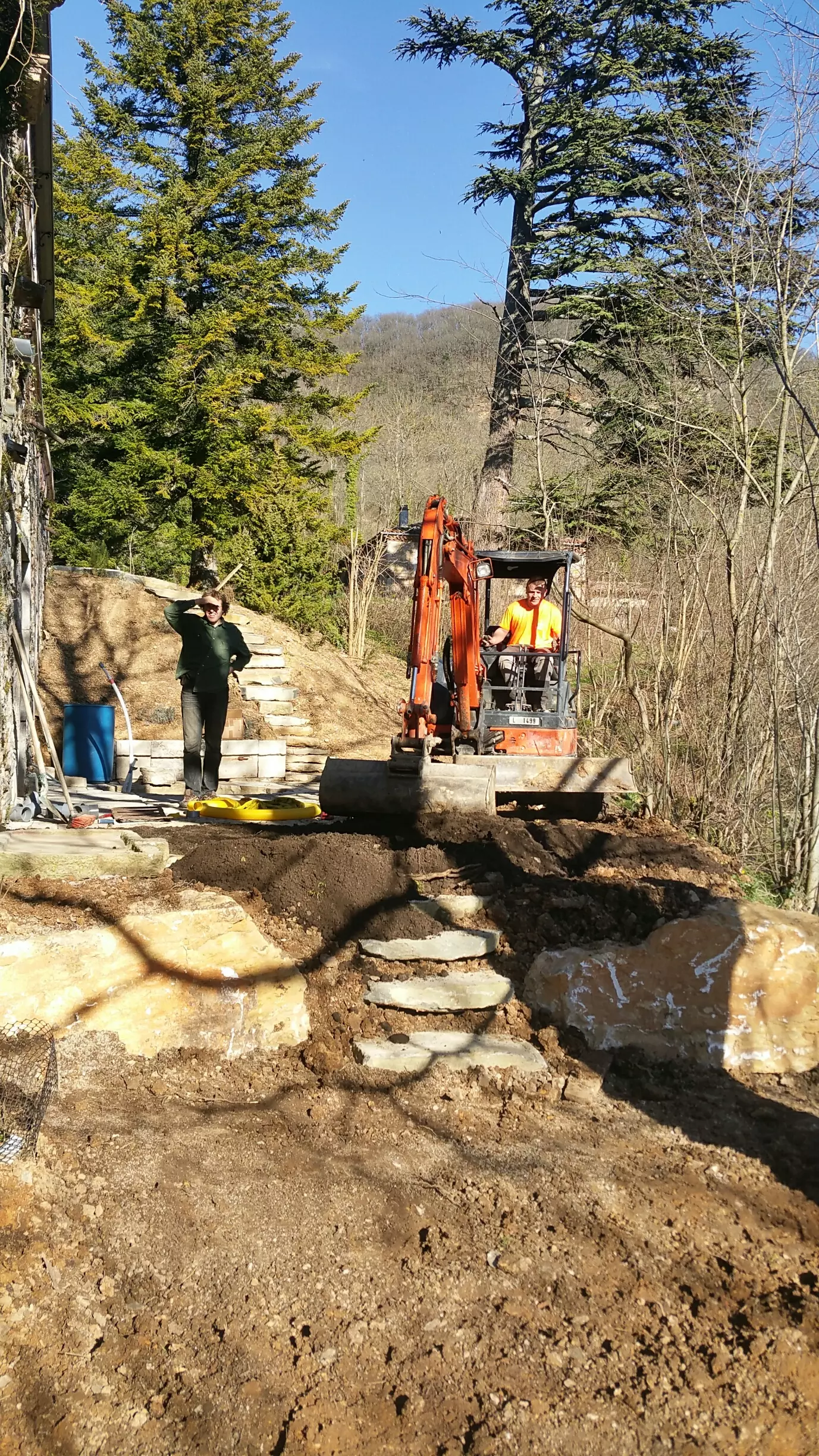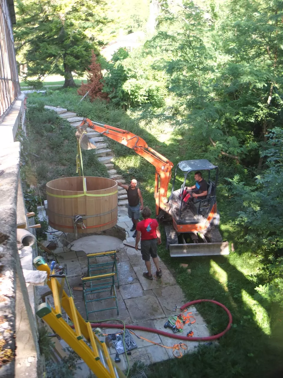First, we scouted around for the perfect spot. Atop the steep slope underneath the orangery seemed ideal. Secluded, protected from the elements by an old wall, yet with a view of the orchard. Only we needed to get rid of all the debris and green overgrowth first and build a handsome terrace from ancient stones with a custom hole for the hot tub.